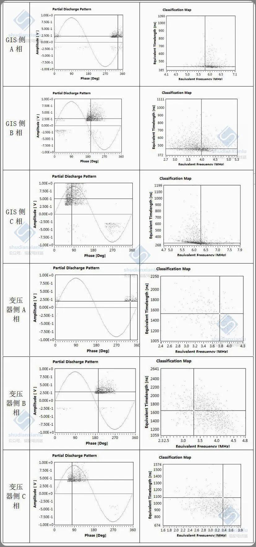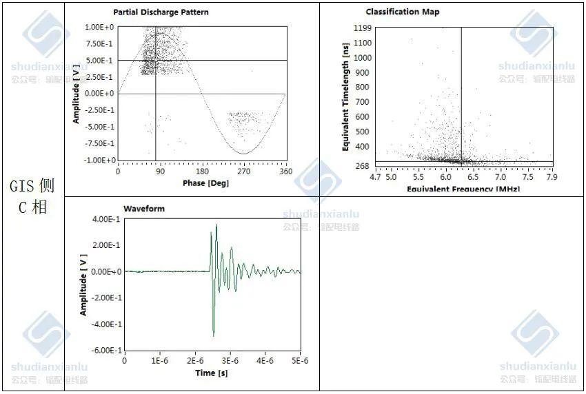 再次分析变压器侧ABC三相的高频检测图谱,从相位图谱上分析,与GIS侧ABC三相的特征相似,表明信号源自C相,从频率上分析,C相频率在2.5-3.6MHz,A相频率在2.8-4.0MHz,B相频率在2.6-4.2MHz,ABC三相都已发散,无法直接判断。从波形上分析,变压器侧与GIS侧ABC三相的特征相似,表明信号来自C相。