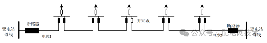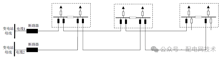 自不同上级电源的中压母线引出两到四回电缆线路构成单环网,如下图所示(示意图为典型“2-1”单环网)。