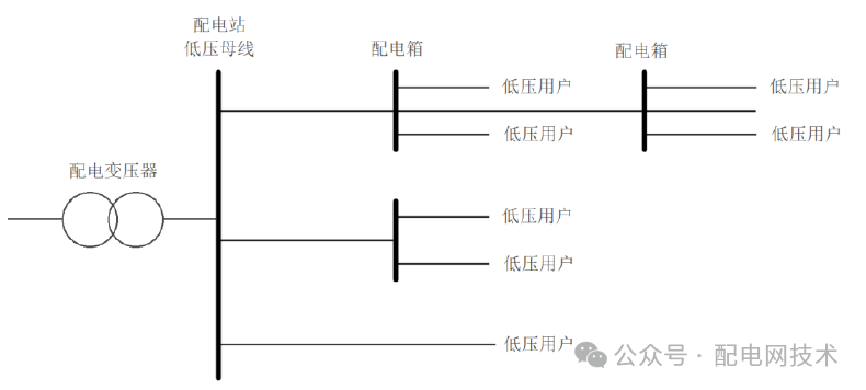 3.低压配电网电网典型结构 低压配电网(220 V/380 V)电网结构示意图如下图所示,采用辐射式接线方式。