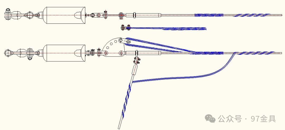 同样,它也是通过原有耐张串的金具剩余孔位,连接在金具串上,与主耐张线夹形成并联关系。
