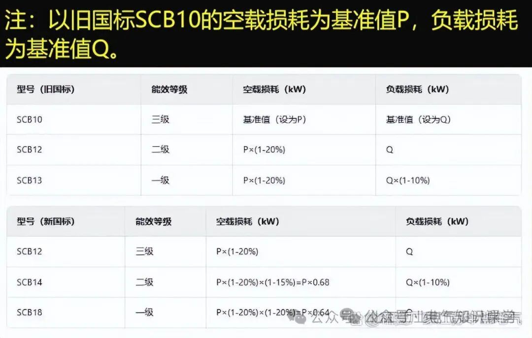 能效等级的核心是“降低损耗”——变压器运行时会损失一部分电能(空载损耗+负载损耗),损耗越低,能效越高。通过新旧国标典型型号的损耗对比(如下表),能效提升一目了然: